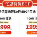 亿恩科技特价BGP 电信联通移动多线BGP互通 BGP服务器租用托管找亿恩 1U的机器 10M的带宽 1个IP 原价6999现在活动价5999一年; 100M的带宽原价29999的现在活动价19999元一年。 适用于视频站,CDN加速,数据缓存,下载站,大型门户站,企业站,数据库...